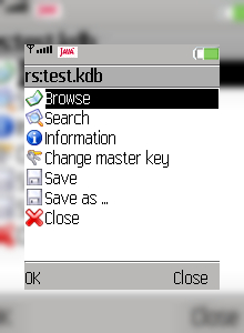KeePass for J2ME is a J2ME port of KeePass Password Safe, a free, open source, light-weight and easy-to-use password manager. You can store passwords in a highly-encrypted database on a mobile phone, and view them on the go.